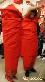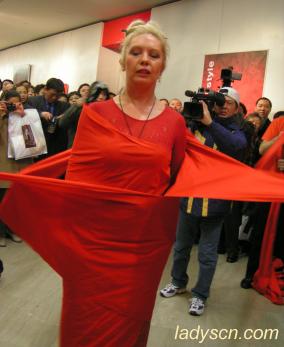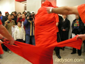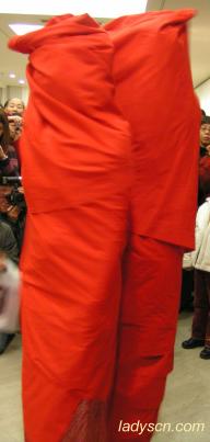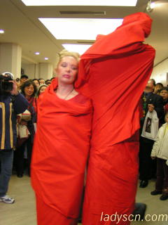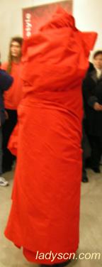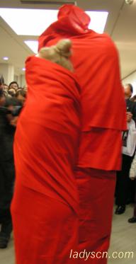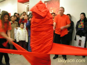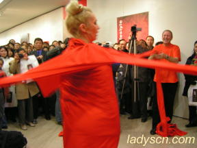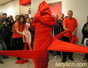 开幕式一结束,女艺术家就现场与观众一起表演了一场行为艺术。没有解说者,也没有翻译,我相信,这是奥娜贝对自我以及作品最概括的一个介绍和总结――“不是我去寻找红色,而是红色找到我。”